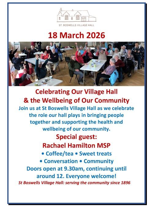 The trustees of St Boswells Village Hall Management Committee have pleasure in inviting you to an event on the morning of 18 March 2026. As our participation in National Village Halls Village Week, we wish to celebrate the role our own hall plays in bringing people together and supporting the health and wellbeing of our community. A major recent achievement has been the attainment of zero carbon emissions from the building, the culmination of three years’ hard work – and substantial fundraising. Zero carbon initiatives provide significant, immediate, and long-term benefits to human health and wellbeing.
